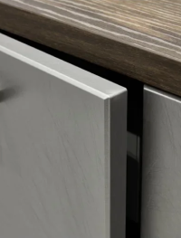 Версия современной кухни с минималистичным характером. В кухне использованы фасады с легким глянцем. Интегрированные ручки подчеркивают элегантный шик поверхностей. Фасады верхних шкафов выполнены на контрасте в темном ламинате под дерево ARTWOOD.