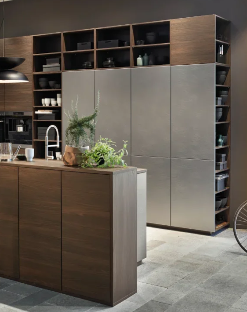 Кухня Nolte Vienna спроектирована для помещения, объединенного с гостиной зоной. Барная стойка выполняет зонирование помещения. Традиционные рамочные фасады с фактурой дуба Шале привносят атмосферу домашнего уюта и тепла.